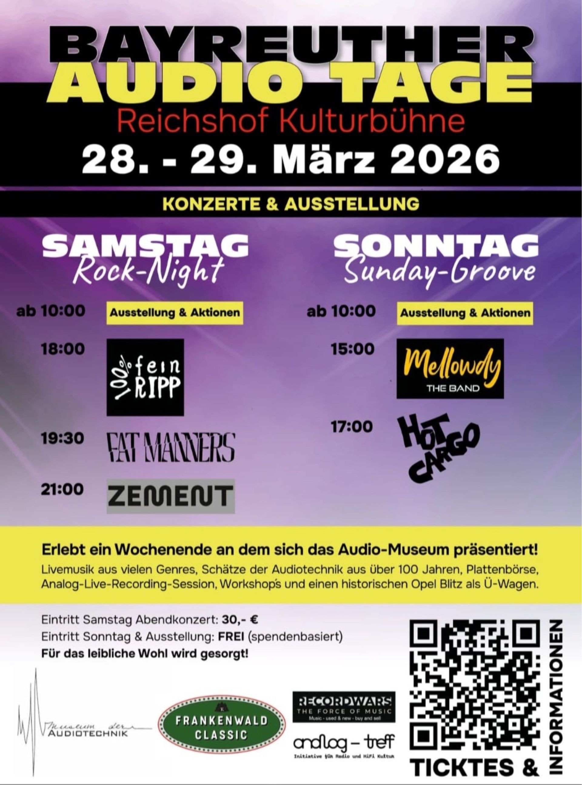 Das Museum der Audiotechnik präsentiert zusammen mit der FRANKENWALD CLASSIC ein unvergessliches Wochenende im Reichshof in Bayreuth mit vielen Live Events und natürlich Exponaten aus dem Museum in Presseck.
